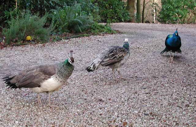 We have a small family of peacocks who live in the garden. The use of the verb "own" would be wholly inappropriate since peacocks have no concept of ownership and usually behave as if we co-habit with them in their garden! They do however appreciate peanuts, and a regular supply does appear to cement the relationship. They eat quite well enough in almost any garden, and they sleep in the trees. (Yes, they do fly, but take off at a rate of climb reminiscent of a fully-laden Lancaster bomber!).